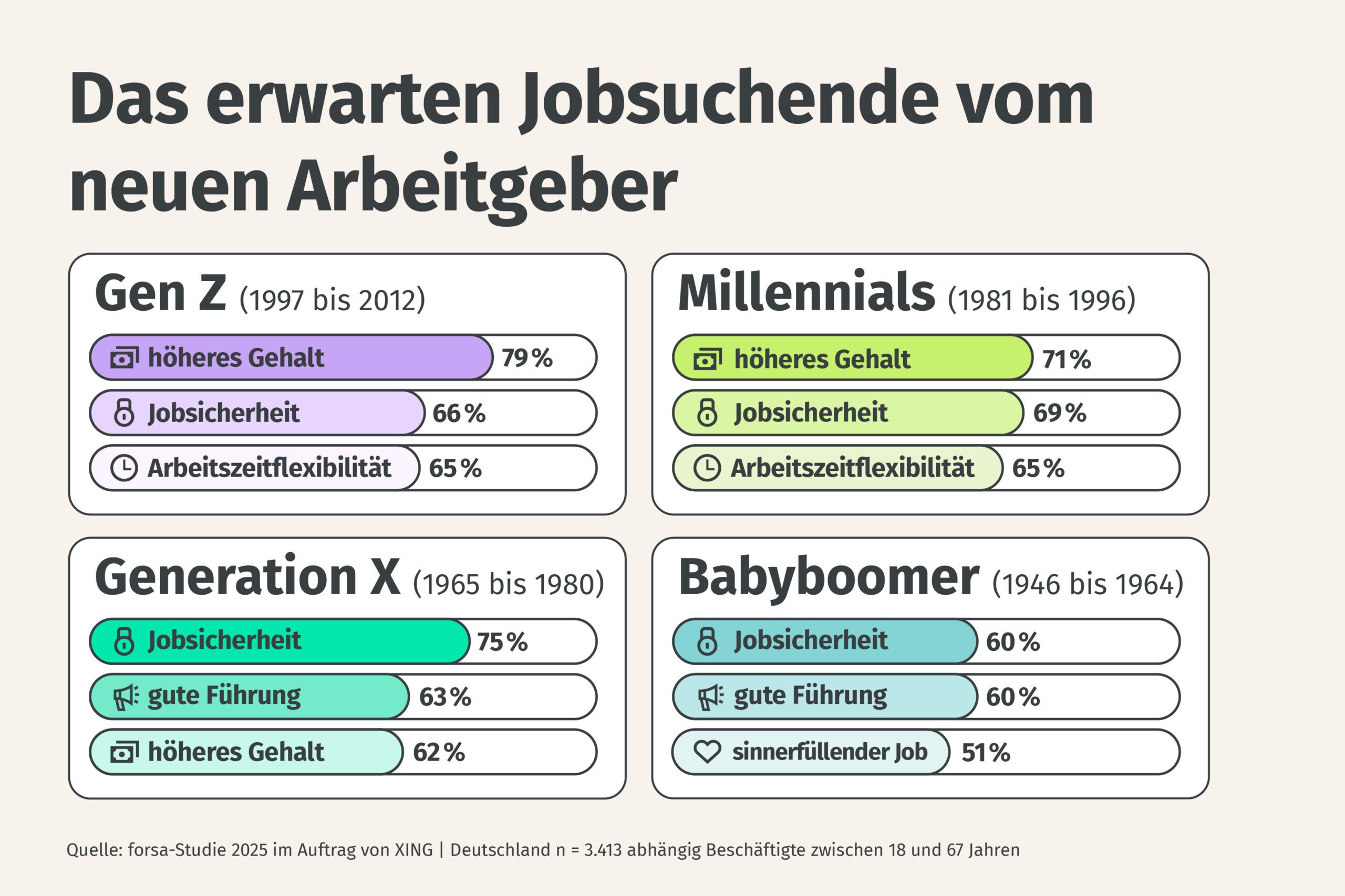 Was wünscht sich die Generation Z von Arbeitgebern? Wie offen sind sie für einen Jobwechsel? Und was erwarten Jobsuchende von einem neuen Arbeitgeber? Das sind Ergebnisse, die forsa im Auftrag von XING erhoben hat. Dabei wurde nicht nur die Generation der jungen Beschäftigten befragt, sondern auch wertvolle Erkenntnisse für alle Altersgruppen am Arbeitsmarkt ausgewertet.